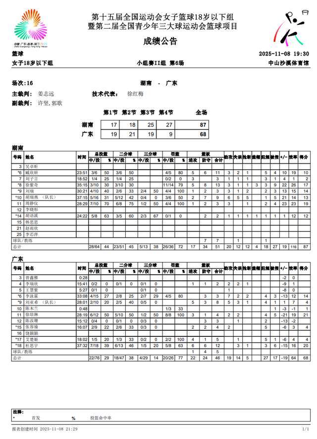 晚上19:30,第二小組打響了2場收官之戰(zhàn),湖南隊(duì)對(duì)陣廣東隊(duì)。沒想到,東道主居然爆冷輸球了,以68-87不敵湖南隊(duì)。湖南隊(duì)六人得分上雙,周靜儀19分,徐紫奇17分13籃板,劉瑞14分,胡瑞燕13分9籃板6助攻,胡語溪12分,臧欣妍10分11籃板。廣東隊(duì)徐培琳21分,杜思宇20分12籃板,李泳霖14分7助攻。湖南隊(duì)3戰(zhàn)3勝,鎖定小組第一,廣東隊(duì)2勝1負(fù),小組第2。