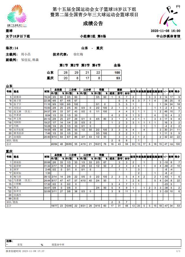 11月8日一共打了4場比賽,下午16點(diǎn),第一小組打了2場,山東隊(duì)對(duì)陣重慶隊(duì),結(jié)果呢,張子宇繼續(xù)爆發(fā),只打了11分鐘,9投9中,砍下18分,小姑娘還在比賽中上演了扣籃,雖然看起來有些勉強(qiáng),但總算是扣了,扣了就好啊。山東隊(duì)以100-53大勝對(duì)手,3戰(zhàn)全勝,鎖定小組第一,晉級(jí)強(qiáng)。孫瑞陽22分,張子宇9投9中得到18分,宋丹佑妮11分。重慶隊(duì)馬嘉潞22分,藍(lán)舒婷10分。