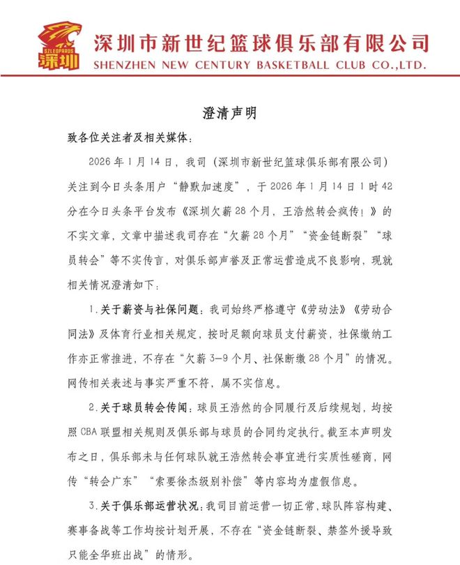 1月14日,深圳男籃更新官方賬號,回擊了不良自媒體關于俱樂部“欠薪”和“球員轉會”等謠言。