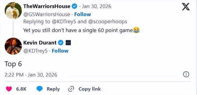 還有球迷提醒他生涯至今尚未單場砍下過60分,杜蘭特則留言:“Top 6”。顯然,是告訴球迷,自己近期剛躋身NBA歷史得分榜第六位。