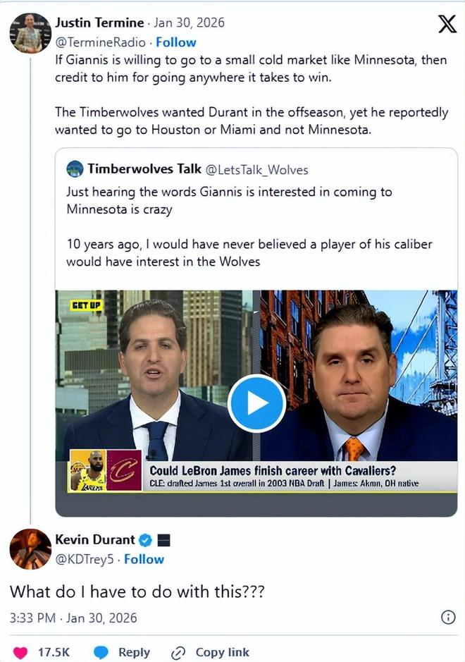 隨后NBA記者Termine轉發該帖子,并配文道:“如果字母哥愿意去明尼蘇達這樣的小球市,那他為了奪冠愿意去任何地方的精神都值得稱贊。森林狼休賽期曾想要杜蘭特,但據說他只想去休斯頓或邁阿密,而不是明尼蘇達。”