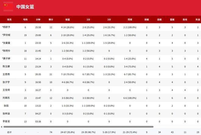 本賽季效力于武漢盛帆的王佳琦出場16分鐘,雖然傷病初愈沒有出手,但全隊最高的4次助攻外加4個籃板,依然展現出這位聯賽助攻王的價值。出自華中科技大學女籃、為湖北征戰全運會的陳玉婕得到了23分鐘的出場時間,有3分和5籃板入賬。兩位選手的主要精力都在防守和適應國家隊節奏上,不算出彩,但貴在踏實。