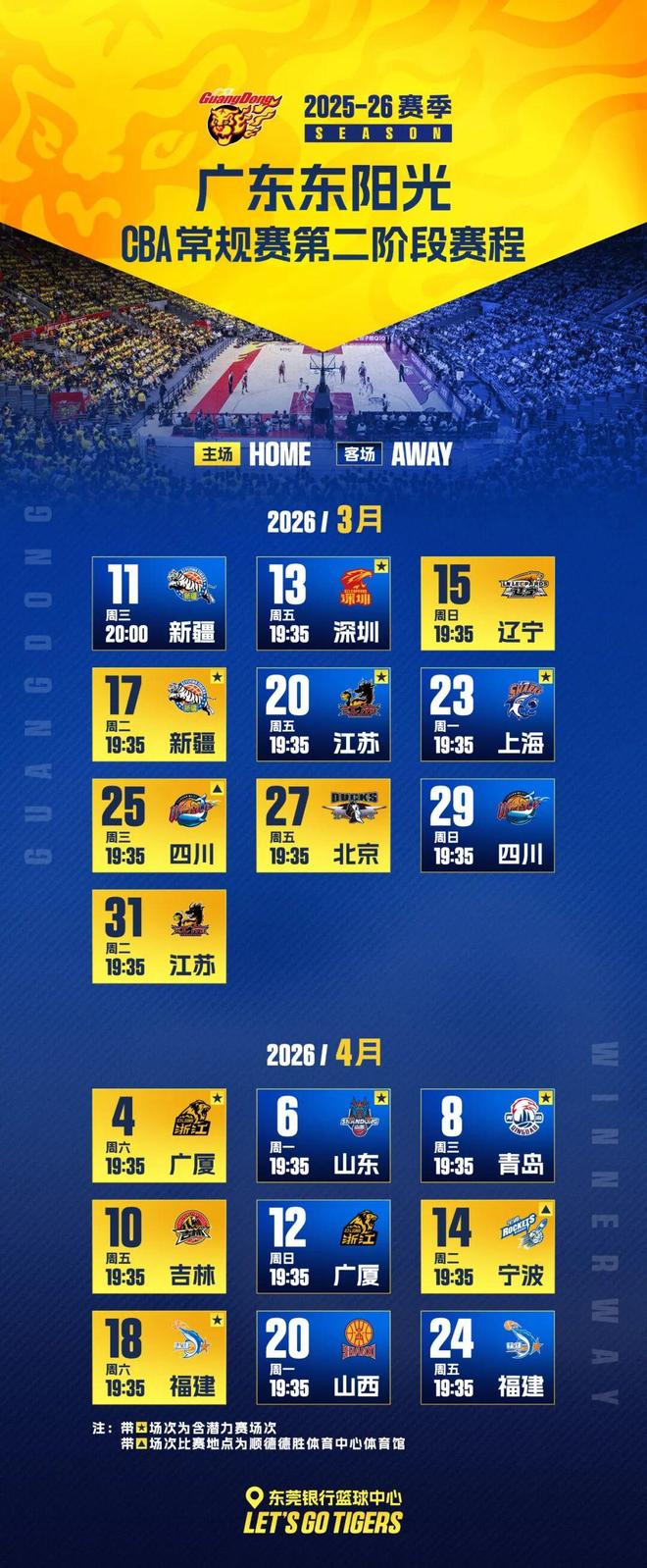 3月11日、13日球隊將先后在客場挑戰新疆、深圳男籃,3月15日(周日),將迎來第二階段主場揭幕戰,迎戰老對手遼寧男籃。讓我們一起為華南虎加油!