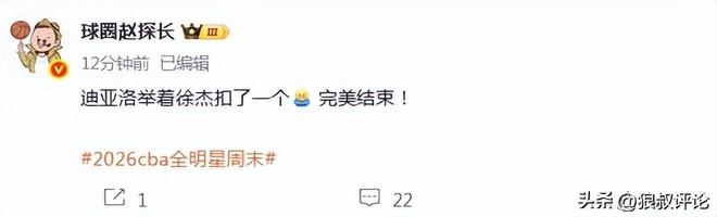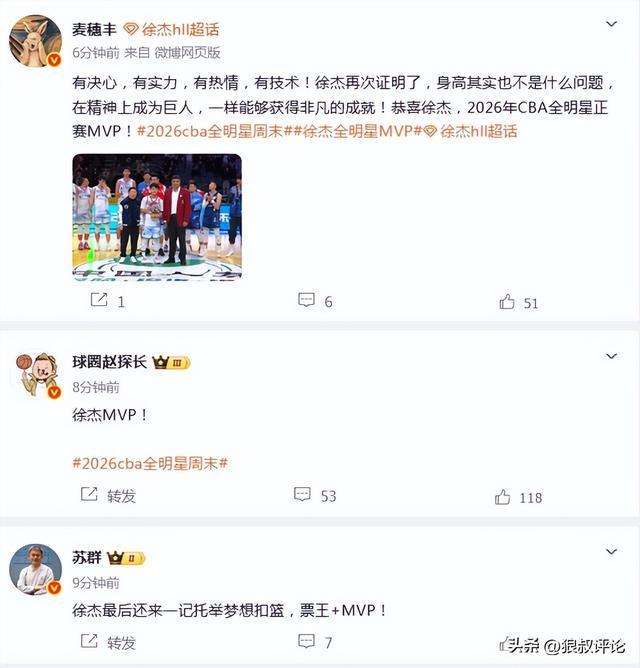 媒體人“麥穗豐”發文點評:有決心,有實力,有熱情,有技術!徐杰再次證明了,身高其實也不是什么問題,在精神上成為巨人,一樣能夠獲得非凡的成就!恭喜徐杰,2026年CBA全明星正賽MVP!