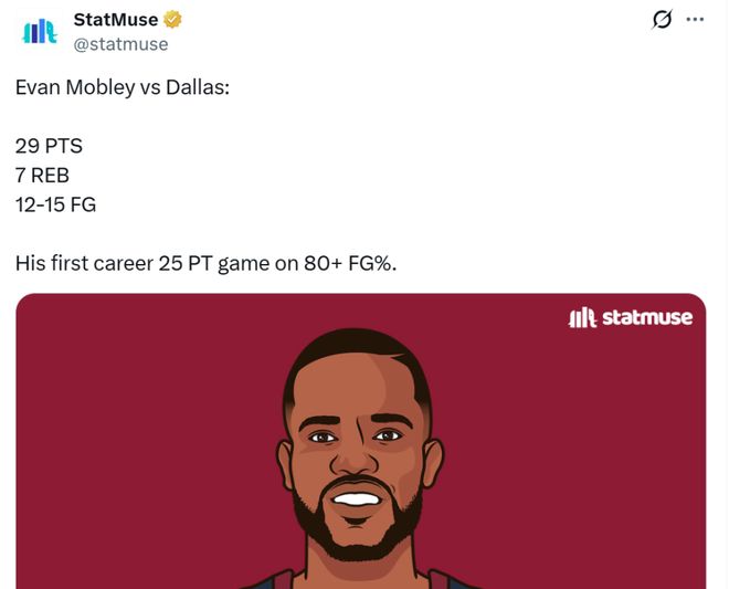 莫布利更是打出生涯標志性一戰,在僅出戰23分鐘的情況下,15中12,拿到29分7板2助1搶斷,這是其生涯首次以80+%命中率砍下25+分。
