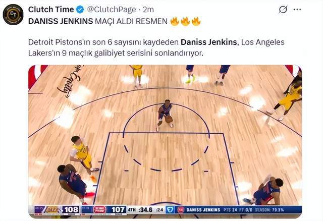 短短25秒時間里,詹金斯一人拿下關鍵6分,硬生生把比賽從湖人手中搶了回來。而反觀湖人一方,最后12秒東契奇急停中投失手,最后一攻的絕平三分更是直接三不沾。對比兩隊關鍵時刻的表現,活塞取勝也就不難理解了。