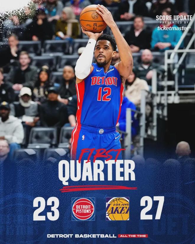 首節(jié)戰(zhàn)罷,湖人27-23領(lǐng)先活塞4分。東契奇膝蓋不適,第一節(jié)打完返回更衣室接受檢查,詹姆斯手指也被戳了一下。兩人問題都不大,第二節(jié)重新登場。斯瑪特缺陣讓湖人的外線防守被針對,活塞單節(jié)三分8中5,第二節(jié)反超湖人!