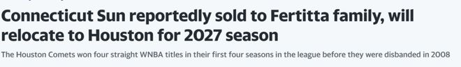 北京時間3月28日,據(jù)ESPN記者菲利普報道,由休斯頓火箭老板費爾蒂塔領銜的費爾蒂塔家族達成協(xié)議,以3億美元收購康涅狄格陽光隊。這支球隊將在今年夏天于康涅狄格打完最后一個賽季后,在2027賽季正式搬遷至休斯頓。