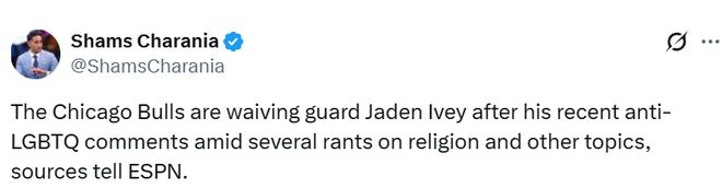 北京時間3月31日,據名記Shams報道,ESPN消息源透露,在艾維近期接連發表反LGBTQ(性少數群體)言論以及大量關于宗教和其他話題的激烈言論后,芝加哥公牛隊已決定裁掉這名后衛。隨后公牛官方宣布,因對球隊有害的行為,球隊已裁掉艾維。
