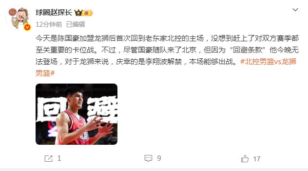 球圈趙探長報道表示:“今天是陳國豪加盟廣州后,首次回到老東家北控的主場,沒想到趕上對雙方賽季都至關重要的卡位戰。不過盡管國豪隨隊來到北京,但因為‘回避條款’,他今晚無法登場。對于廣州來說,慶幸的是李翔波解禁,本場能夠出戰。”