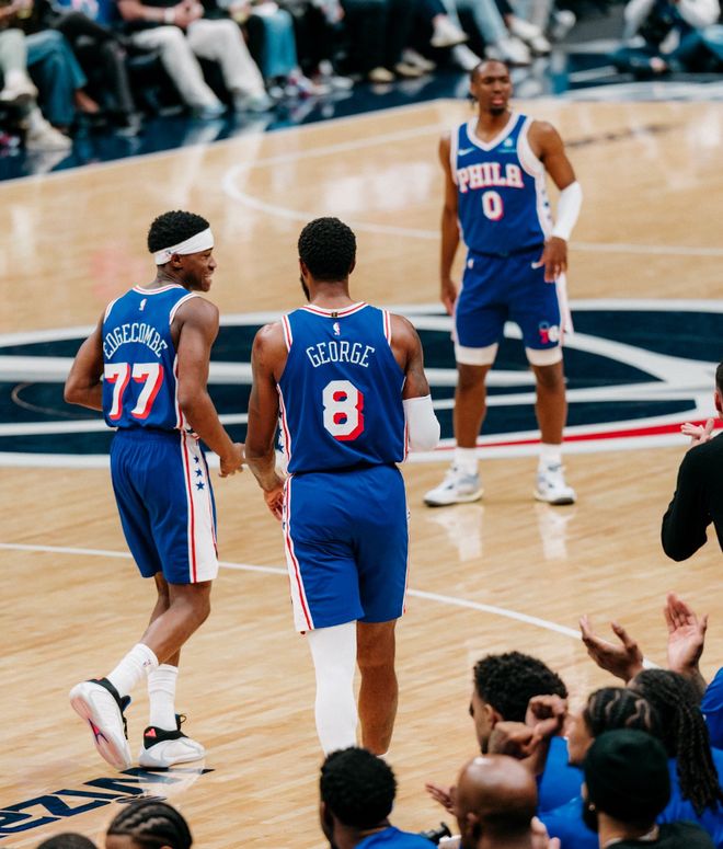 馬克西此役34分鐘拿到28分9助攻1搶斷,埃奇庫姆33分鐘23分10助攻,而喬治30分鐘,22中15,三分12中6,罰球4中3,拿到39分6助攻5籃板3搶斷0失誤,命中率68.2%,三分命中率50%,真實(shí)命中率82.1%,正負(fù)值+26。