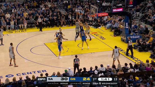 第一節(jié)結(jié)束前的一幕讓人印象深刻,當(dāng)時(shí)文班亞馬接球,面對(duì)理查德防守,運(yùn)一步后,直接在內(nèi)線協(xié)防的尤爾特賽文頭上完成了一記天賦碾壓式的超級(jí)隔扣。