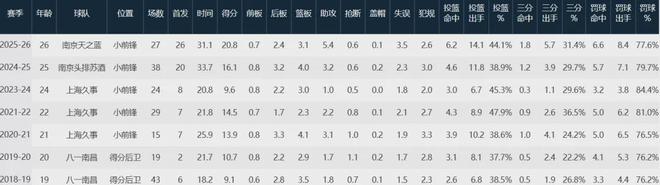 新任當(dāng)家球星郭昊文,出戰(zhàn)了其中27場比賽,場均上陣31.1分鐘貢獻20.8分3.1板5.4助3.5失誤(高居聯(lián)盟第一),三項命中率44.1%、31.4%和77.6%。