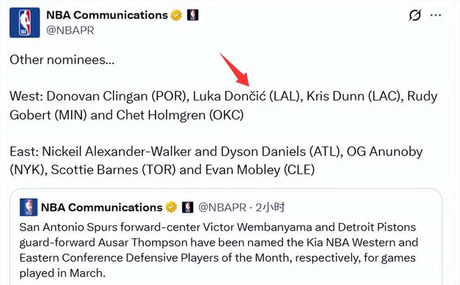 北京時(shí)間4月3日,洛杉磯湖人隊(duì)后衛(wèi)盧卡-東契奇當(dāng)選NBA三月西部月最佳球員。這是他本賽季第二次、職業(yè)生涯第七次獲得該月度榮譽(yù)。