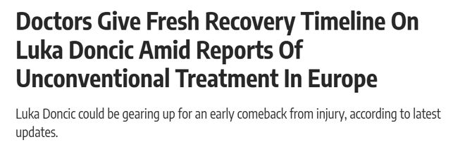 綜合兩位醫生的看法,使用新療法的東契奇有望在3周左右復出趕上季后賽首輪的部分比賽。不過,這也確實要冒著傷勢加重的風險。