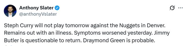 北京時(shí)間11月7日,據(jù)勇士隊(duì)記Slater報(bào)道,庫(kù)里明日將不會(huì)出戰(zhàn)在丹佛對(duì)陣掘金隊(duì)的比賽。他此前因感冒缺席了對(duì)國(guó)王的比賽,且病情于昨日加重。巴特勒因傷出戰(zhàn)成疑(上場(chǎng)概率50%),追夢(mèng)大概率能夠上場(chǎng)。