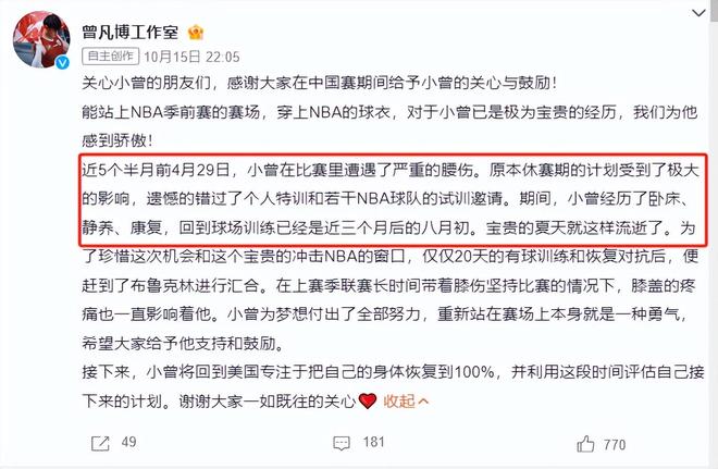 他個(gè)人的工作室也隨之發(fā)出聲明,表示小曾在4月末的比賽中受到了嚴(yán)重的腰傷,