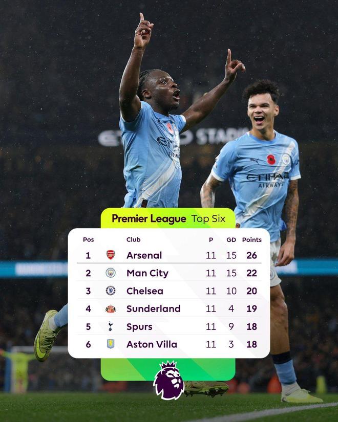 目前,英超陷入“大亂戰”狀態。阿森納26分領跑,曼城22分第2,切爾西20分第3,桑德蘭19分第4。