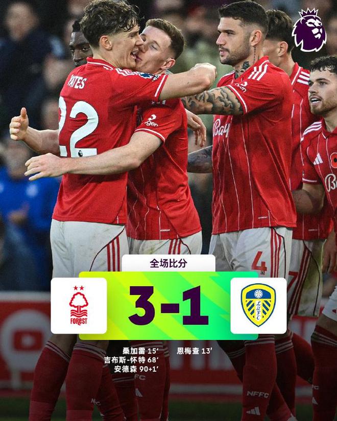 上半場,恩梅查禁區內低射破門,幫助利茲聯1-0領先,隨后不久,桑加雷補射破門,幫助諾丁漢森林1-1快速扳平。下半場,吉布斯-懷特、安德森各進一球,幫助諾丁漢森林3-1完成逆轉。