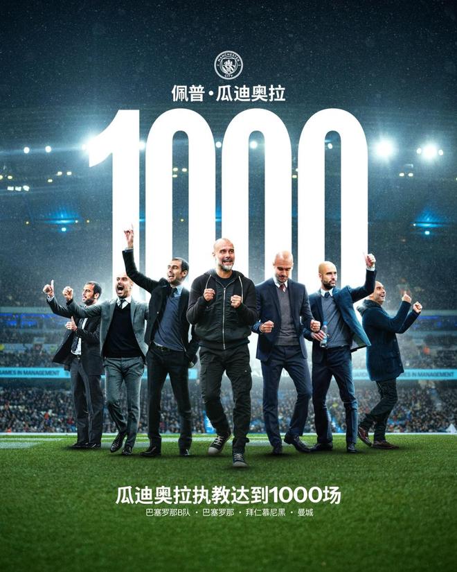 在執教生涯的前999場比賽里,瓜迪奧拉已經贏得了40座獎杯,包括3次贏得歐冠,6次贏得英超、3次贏得西甲和德甲冠軍。