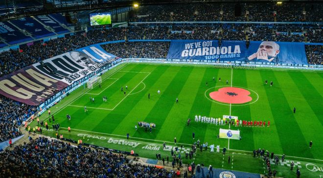 值得一提的是,本場比賽正是瓜迪奧拉執(zhí)教生涯的第1000場比賽,阿提哈德球場擺起了巨大的TIFO,干向瓜迪奧拉致敬。