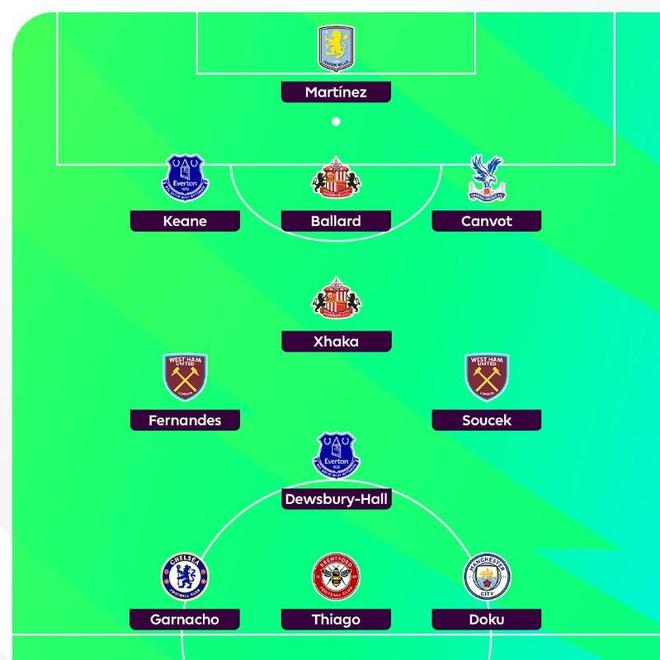 中場:扎卡(桑德蘭)、馬特烏斯-費爾南德斯(西漢姆聯)、紹切克(西漢姆聯)、迪尤斯伯里-霍爾(埃弗頓)