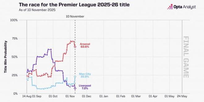 Opta曬英超本賽季截至目前的爭(zhēng)冠概率走勢(shì):利物浦從賽季初被看好跌到目前的7%,阿森納目前63.6%,曼城目前22.9%的。不過(guò)藍(lán)月提升速率很可靠,這是不少阿森納粉絲憂慮的。