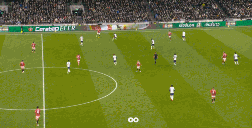 既然如此,要拉就要爭取拉到頂,拉到對方真的跟不上,這就是此前姆貝烏莫、庫尼亞、阿瑪德-迪亞洛和布魯諾組成前場的邏輯:四人全矮,而且全部可以拉邊處理球,從而在反擊戰和陣地戰當中,要么有效捕捉縱深空間,要么在局部流暢地制造人數優勢。