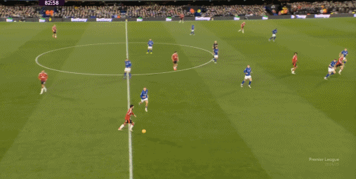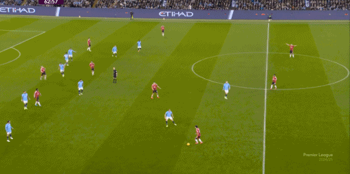 戈登真正做的好的地方,是他在中鋒位置高頻回撤接應之外,還能通過其他方式幫助球隊:雖然他確實沒有背身頂住馬奎爾和約羅的能力,但卻因為邊鋒出道的原因,擁有拉邊接球,從邊路向門前施壓的能力: