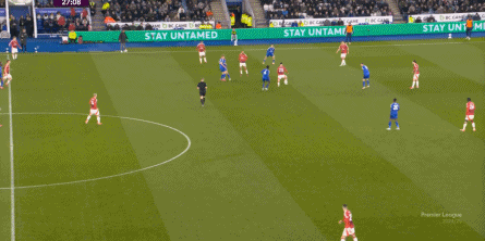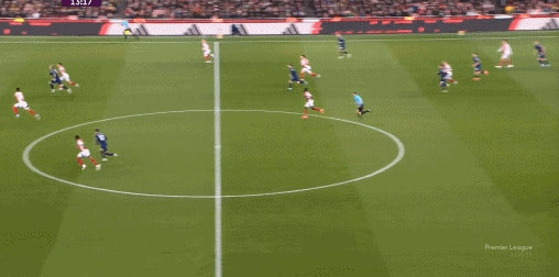 布魯諾和庫尼亞連接失敗,特里皮爾一腳傳球,讓替補登場的奧蘇拉完成提速、推進,直接來到進攻位置: