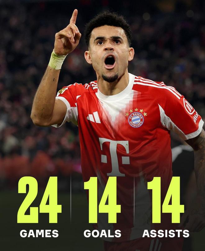 第34分鐘。穆西亞拉在中場帶球推進后分球,格雷茨卡禁區前沿送出挑傳,路易斯·迪亞斯高速插上凌空抽射打破僵局,拜仁1-0領先。