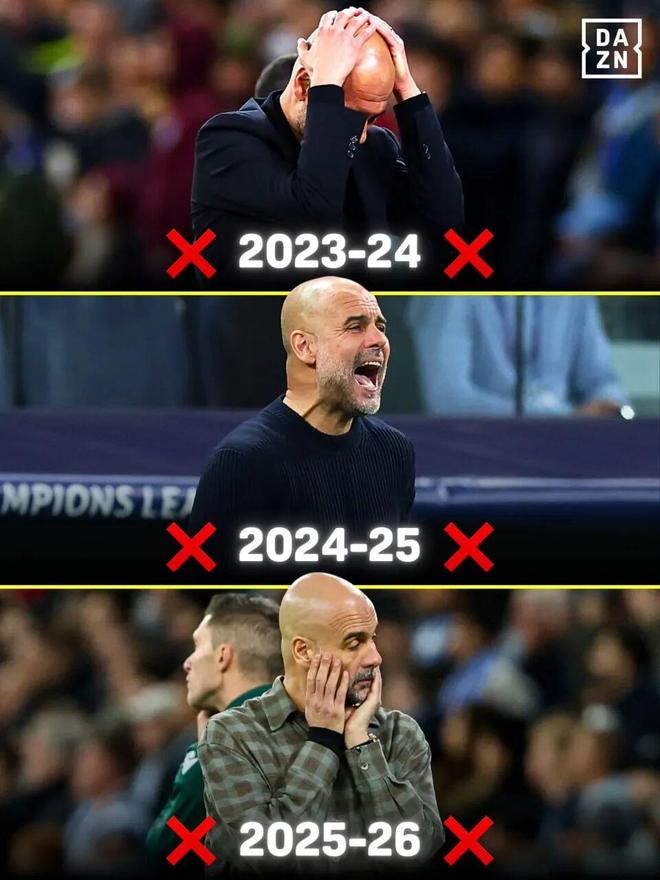 瓜迪奧拉執教生涯第5次歐冠被皇馬淘汰,第4次歐冠被雙殺出局,其中3次對手是皇馬,還是連續3個賽季被皇馬淘汰。西班牙名帥16次歐冠淘汰賽僅2次無緣8強,就是最近這2個賽季,對手還是皇馬,皇馬似乎是瓜迪奧拉的“命定克星”。