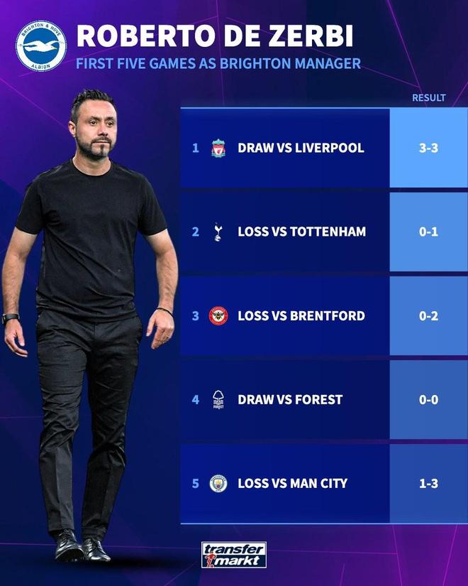 德澤爾比曾在2022年至2024年執教英超球隊布萊頓,在這位意大利教練帶領的前5場比賽中,布萊頓一場未勝,戰績為2平3負,分別戰平利物浦和諾丁漢森林,輸給了熱刺、布倫特福德和曼城。