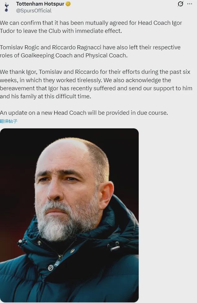 熱刺感謝了圖多爾及其教練組的工作,并表示關于新主帥的任命將在適當時刻公布。