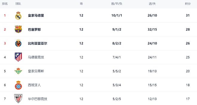 在積分榜上,皇馬戰(zhàn)績是10勝1平1負(fù),拿到31分,依然占據(jù)榜首位置。巴薩總積分是28分,縮小了與皇馬的差距,排名第2。第3的是比利亞雷亞爾,拿到26分。馬競以25分排名第4。皇家貝蒂斯這輪只拿到平局,總積分20分,排名第5。西班牙人以18分排名第6。