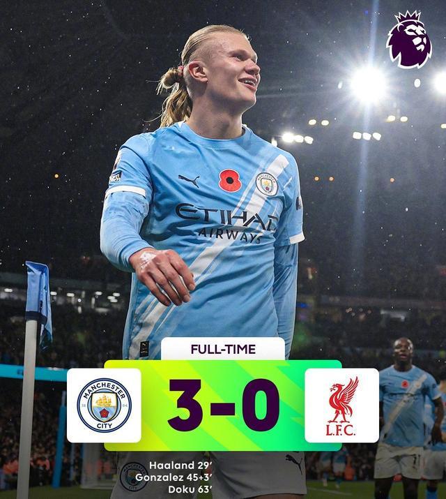 全場戰罷,曼城主場3-0大勝利物浦,收獲各項賽事4連勝,11輪積22分位列英超第2,距離榜首球隊阿森納還差4分!