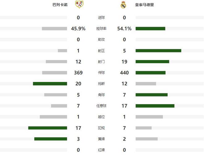 第60分鐘姆巴佩才在禁區左側完成了全場比賽第一腳打門,但沒有能夠命中目標,不甘心一場平局的阿隆索,隨后連續換上塞巴略斯、羅德里戈和阿諾德,想要提升進攻的質量,但巴列卡諾沒有給銀河戰艦打破僵局的機會,如愿將0-0的比分保持到了終場。