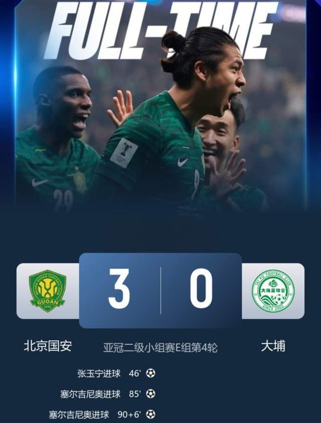 最終,經過90分鐘激戰,坐鎮主場的北京國安隊3-0擊敗港超球隊大埔,取得亞冠二級聯賽首勝。