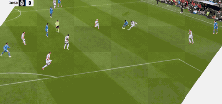 2分鐘后,皇馬繼續猛攻,卡雷拉斯下底傳中,之前在角球進攻中還沒有回防的阿森西奧無人盯防頭球攻門,遺憾頂偏。