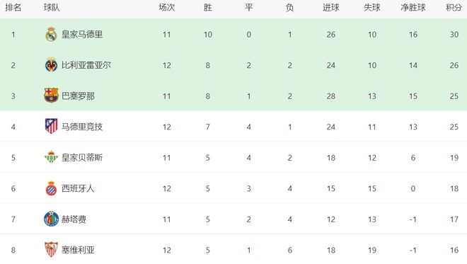 在積分榜上,皇馬以30分領跑,10勝1負的戰績極其出色。比利亞雷亞爾這匹大黑馬超越了巴薩,升到了第2名。比利亞雷亞爾的戰績是8勝2平2負,拿到26分。而巴薩只拿到25分,排名第3。不過,巴薩比比利亞雷亞爾少踢1場。馬競贏球之后,總積分也達到25分,只是因為凈勝球不如巴薩,只能排名第4。皇家貝蒂斯以19分排名第5。第6的是赫塔費,拿到了17分。