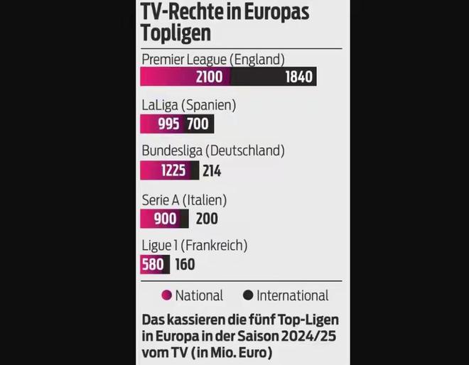 如果說更加直觀的數據就是轉播收入,我們以2024/25賽季為例,英超的國內轉播21億歐、海外轉播18.4億歐共計39.4億歐,在五大聯(lián)賽中遙遙領先。西甲國內9.95億歐、海外7億歐合計16.95億歐排在第二,德甲國內12.25億歐、海外2.14億歐合計14.39億歐排在第三,曾經貴為世界第一聯(lián)賽的“小世界杯”意甲只有國內9億歐、海外2億歐合計11億歐,排在第四位,只比沒什么存在感的法甲高一些而已。特別是海外轉播權,意甲只有2億歐,是西甲的28.6%、英超10.9%!